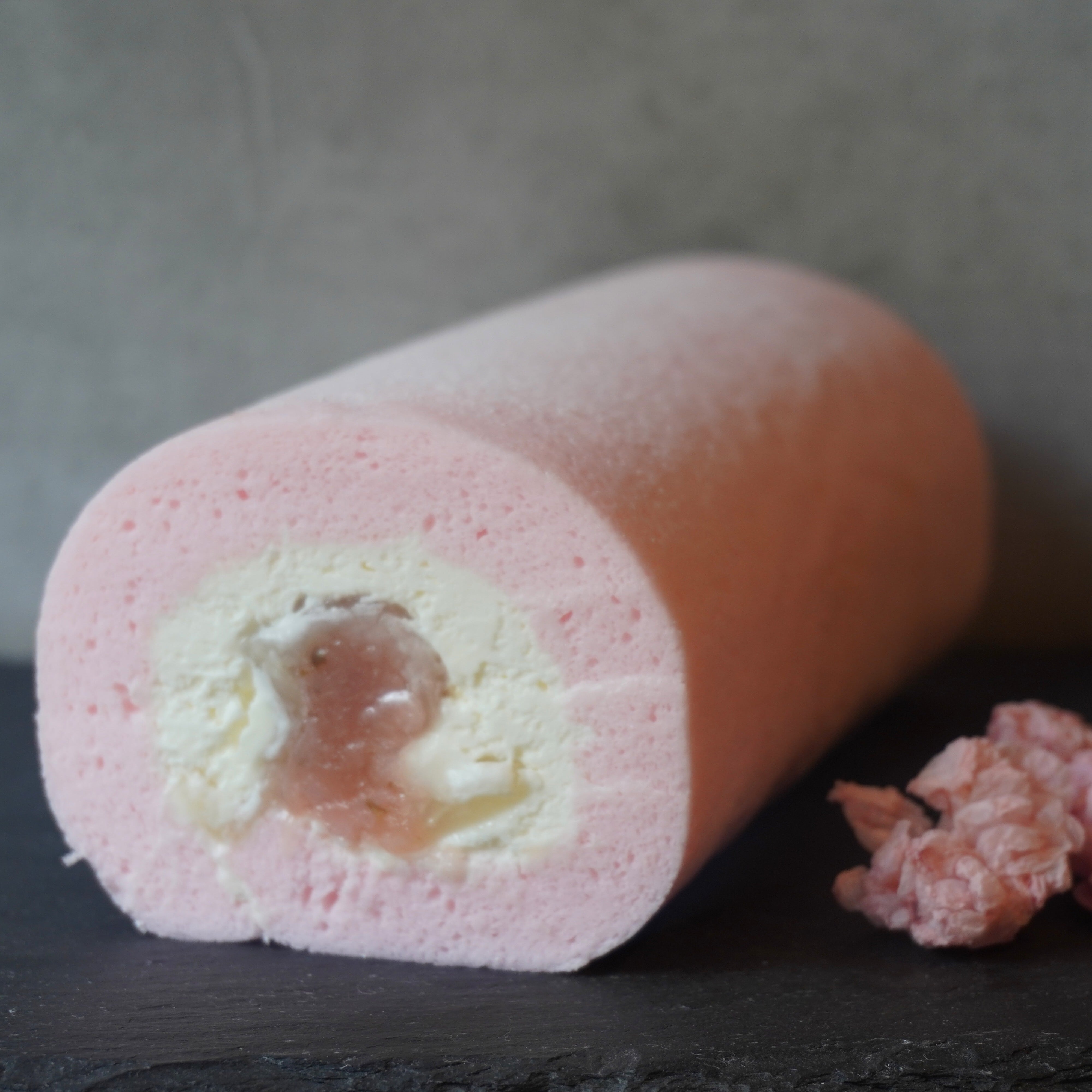 しっとり焼き上げた桜生地の中に、とろけるマスカルポーネクリームと、もちもちの求肥、香り高い桜餡を忍ばせた、食感豊かなロールケーキです。
